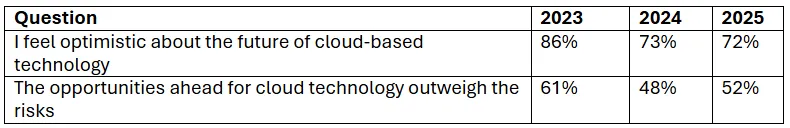 CloudFest turned to its members in 2023 and 2024 to learn about the current state and future of the industry and they did the same this year. Brooke Edge, from Open Eye, presented the state of global cloud market report and the trends for 2025. With a sample of over 600 global responses, in-depth expert interviews, and fill in date with ~1 week before CloudFest, the report passed statistical significance. 2025 outlook is not as bright as it was in 2023 and brings additional stressors that factor on the continued dip. AI is not seen as a villain, but is not seen as the hero either, at least not yet. Here are some interesting trends in responses for the past 3 years: